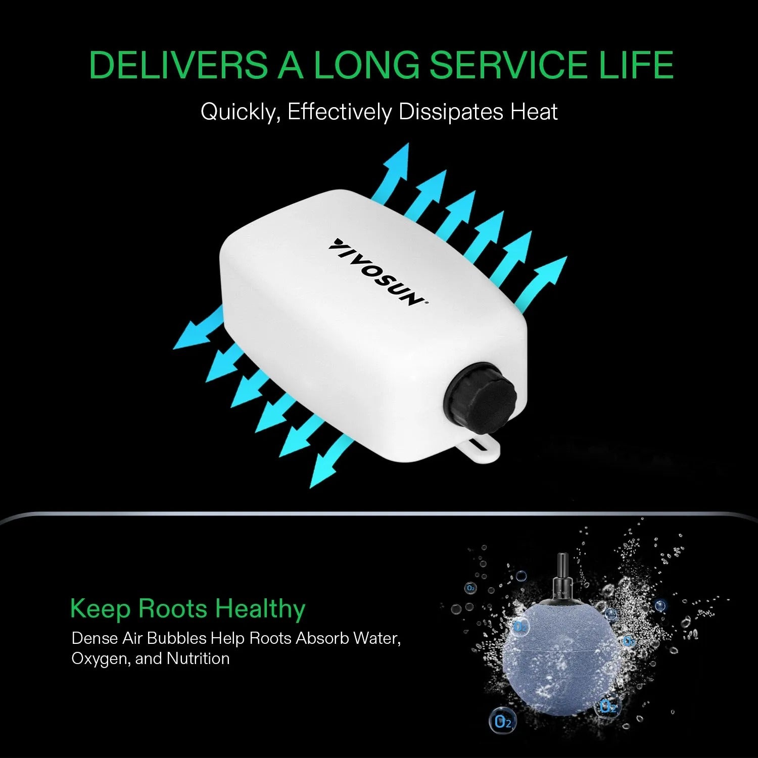 Delivers 7L/min airflow to your reservoir, oxygenating the nutrient-rich water to stimulate strong root development and prevent stagnation.