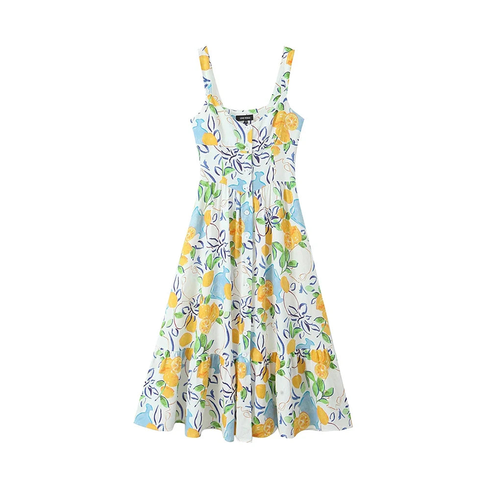 Brighten up your summer wardrobe with this beautiful floral dress, adorned with a vibrant lemon print that exudes beachy vibes and sunshine. Crafted from a blend of cotton and polyester, this dress combines breathability with a slight stretch for a comfortable fit. The slim-fit, A-line silhouette enhances your shape, while the V-neckline and spaghetti straps add a touch of elegance. This mid-calf dress also features a backless design, making it perfect for warm days by the beach or casual outings. Available in sizes XS to L for an ideal fit: