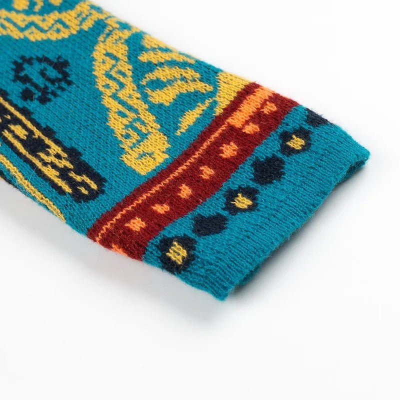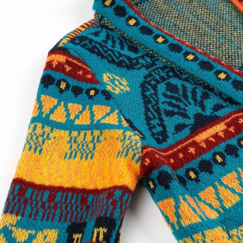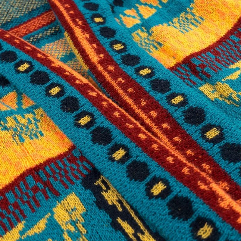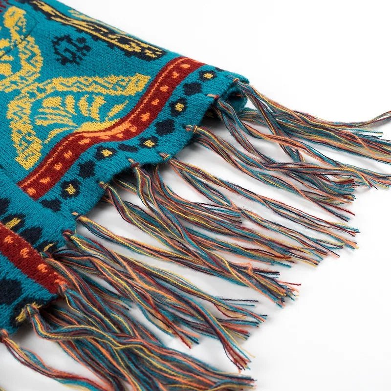 Wrap yourself in warmth and effortless style with this Bohemian Tassel Knit Kimono Cardigan — the ultimate layering piece for free-spirited souls. Designed in a rich palette of teal, mustard, rust, and deep red, this indie folk-inspired cardigan features a unique woven pattern with tribal-style stripes and art deco motifs that make a bold hippie statement.