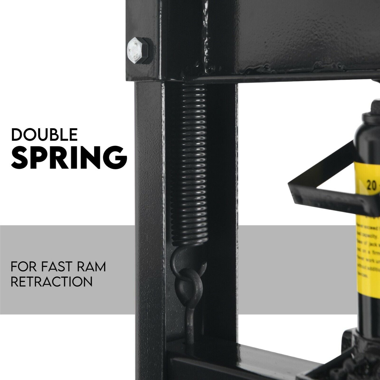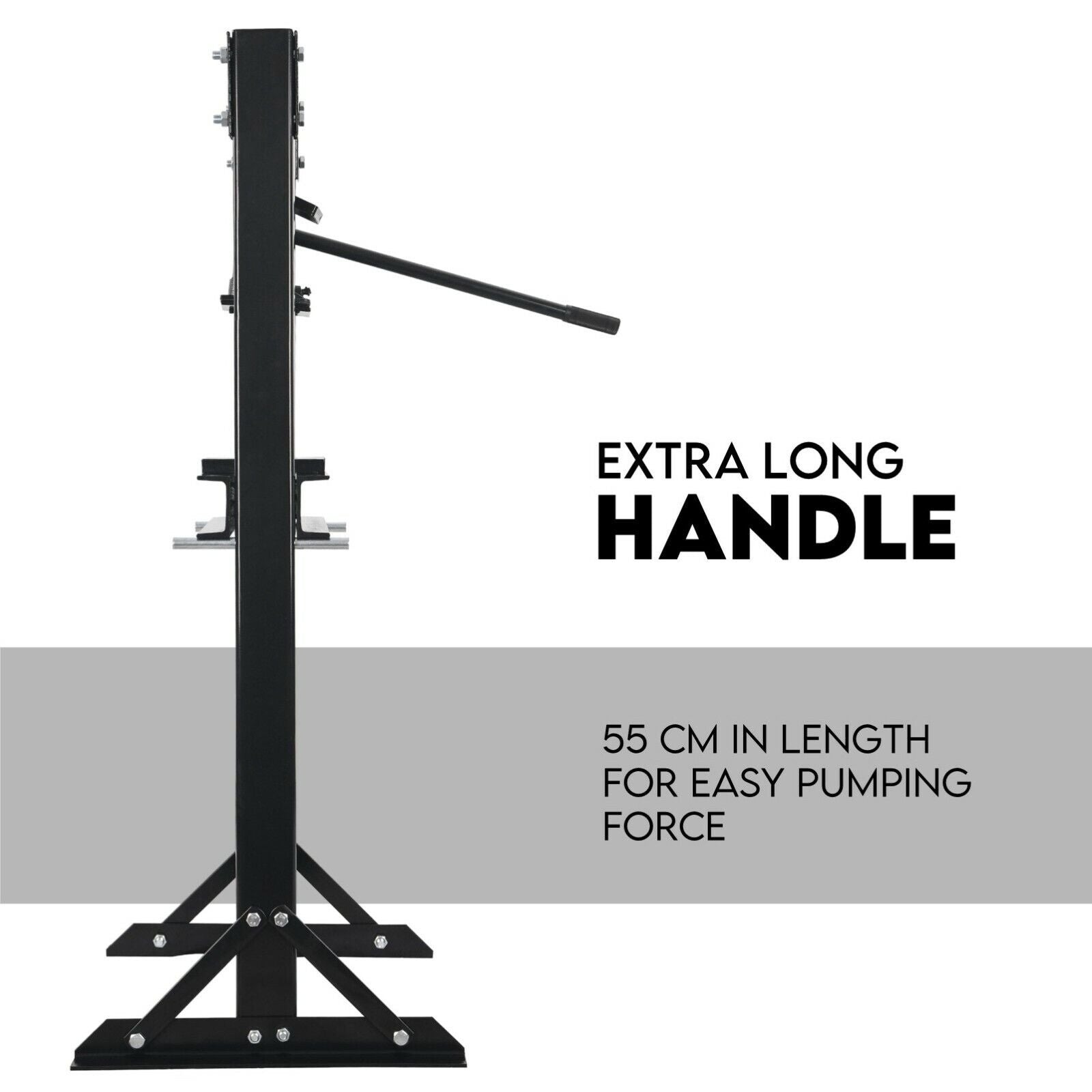 Its bottle jack produces 20 tonnes of continuous pressing force and may be used with the manual hand pump. The dual ram return tension springs ensure smooth and safe operation and can slide along the top of the press to adjust horizontally and extends from its base.