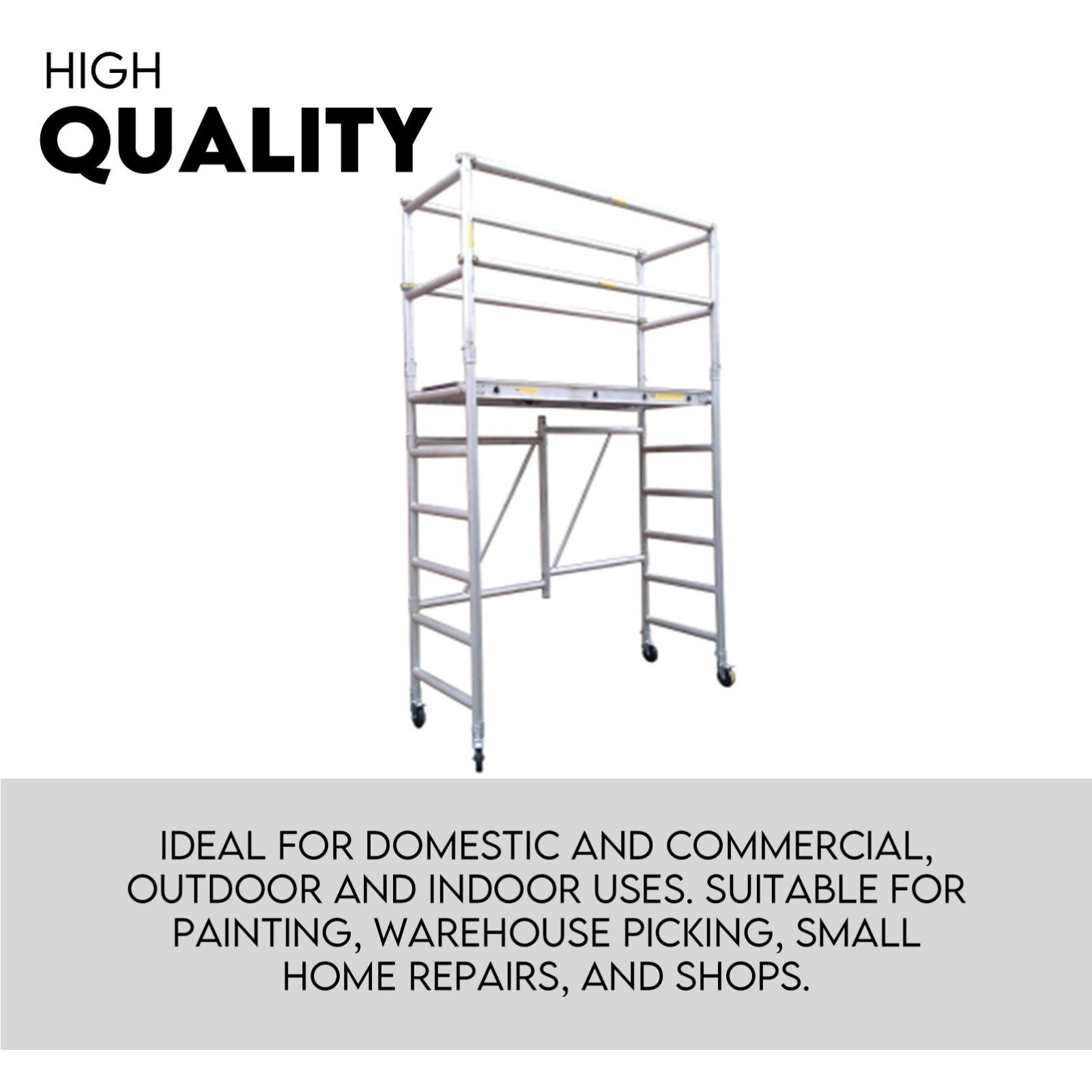 The scaffolding is ideal for domestic and commercial, outdoor and indoor uses. It is suitable for painting, warehouse picking, minor home repairs, and shops.