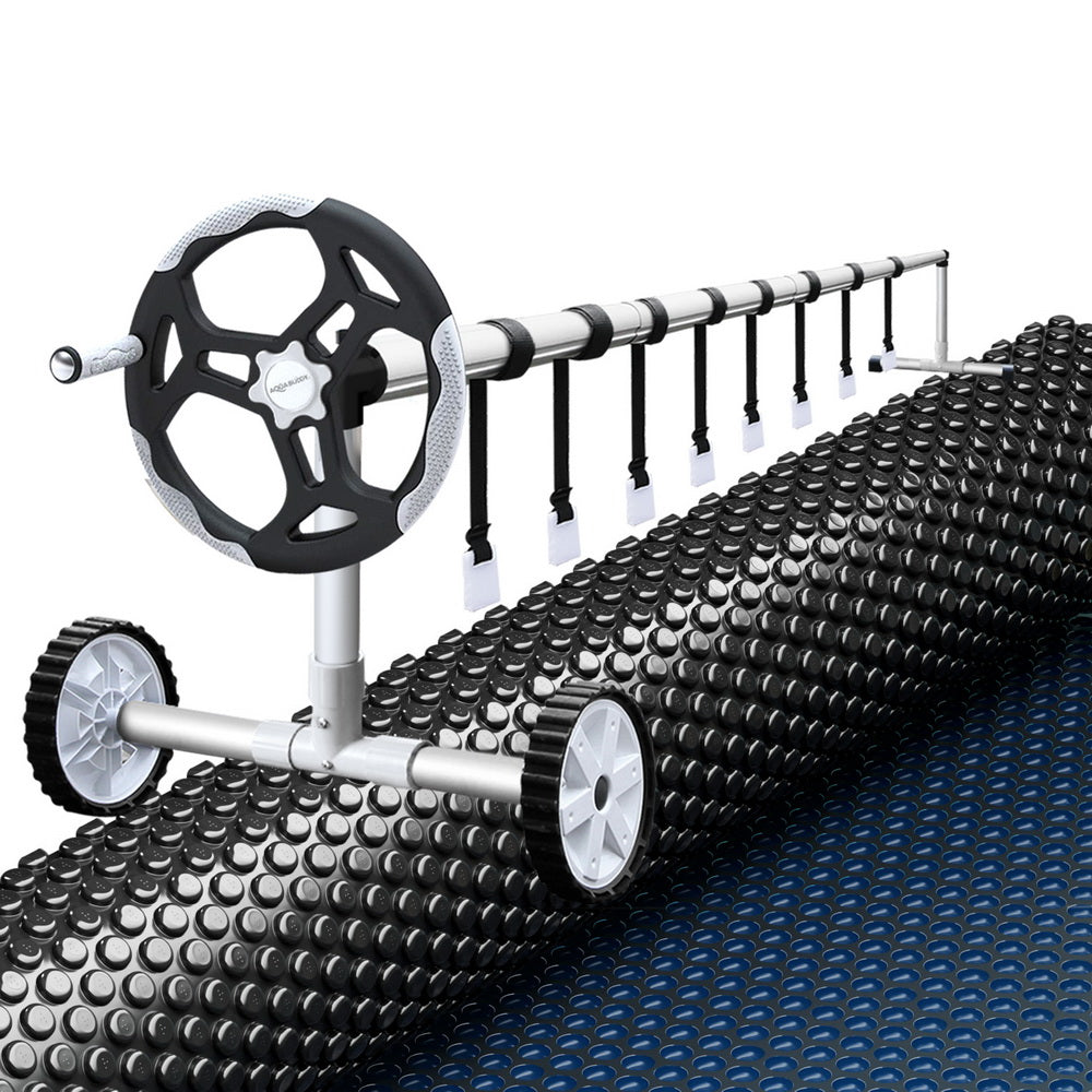 Keep your pool clean from debris and warm from the power of the sun with Aquabuddy's Aluminium Pool Roller and 6.5m x3m Pool Cover. Made of sturdy aluminium construction with full adjustability, this pool roller is suitable for pools with a width between 2.4m-5.55m. It is equipped with premium anodized aluminium alloy telescopic poles, plastic wheels for maximum portability, and a low friction crank wheel to easily roll up your pool cover and get right in the water. The solar pool cover is made from premium low-density 600-micron polyethylene, which makes it extremely durable. The blue top and black underside allow the sun's rays to penetrate the pool, increasing the temperature and significantly reducing water evaporation. Finally, the cover keeps the pool water clean all year round, reducing the time spent maintaining the water, pumps and filters. Get the best of natural resources and save money on chemicals and water; get yourself an Aquabuddy Pool Roller and Cover set today!