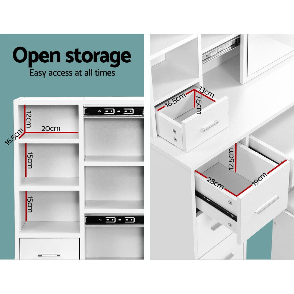 Beauty is in the eye of the beholder. And our Artiss Dressing Table Set is definitely a beauty to behold. Made of sturdy particle board with melamine finish, the dressing table is embellished with many practical features. Behind the sliding mirror lies hidden storage shelves for personal essentials. Plus, the three open shelves also provide a myriad of display space for all your makeup, fashion accessories and more. The dressing table also comes with five drawers of various sizes for extra storage options, with the main drawer being lockable. It offers ample legroom too for you to groom with minimum hassle and a well-padded stool completes the ensemble. Not least, the smooth and impeccable white finish makes for an easy blend with any decor as well as hassle-free maintenance. Create your own personal styling zone with our beautiful and functional dressing table set.