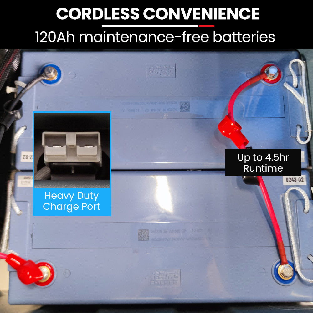 Freedom from cords enhances this scrubber’s utility, powered by dual 12V/120Ah sealed maintenance-free batteries, ensuring up to 4.5 hours of continuous operation.