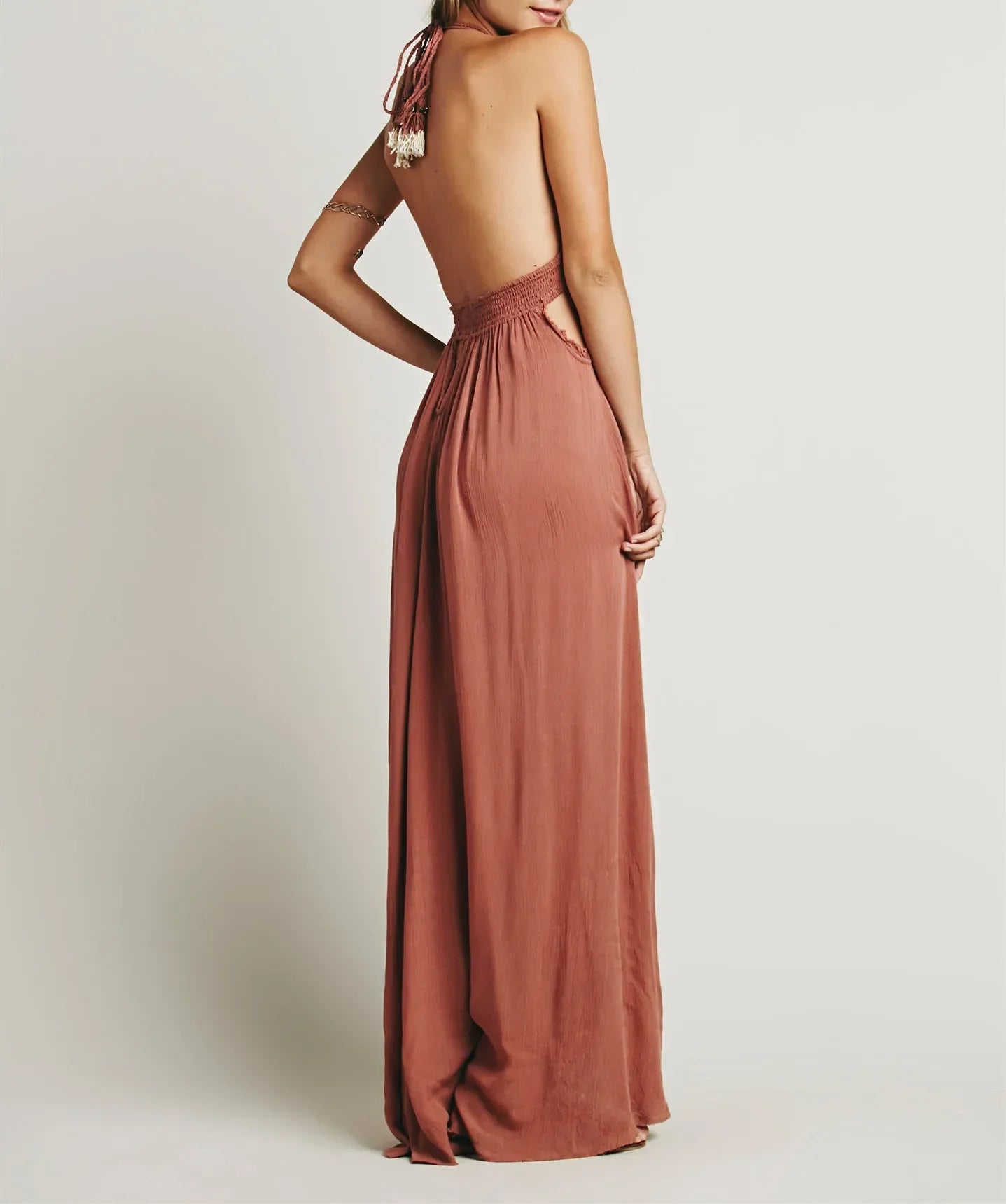 Step into the sunshine with this effortlessly chic Boho Beach Sundress, designed for the free-spirited woman who loves to blend comfort with style. Featuring a flattering V-neckline, backless design, and flowy A-line silhouette, this ankle-length maxi dress is perfect for beach holidays, resort wear, or lazy summer afternoons.