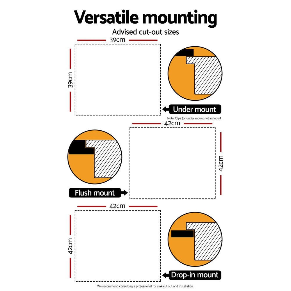 Suitable for under mount, flush mount, and drop in mount