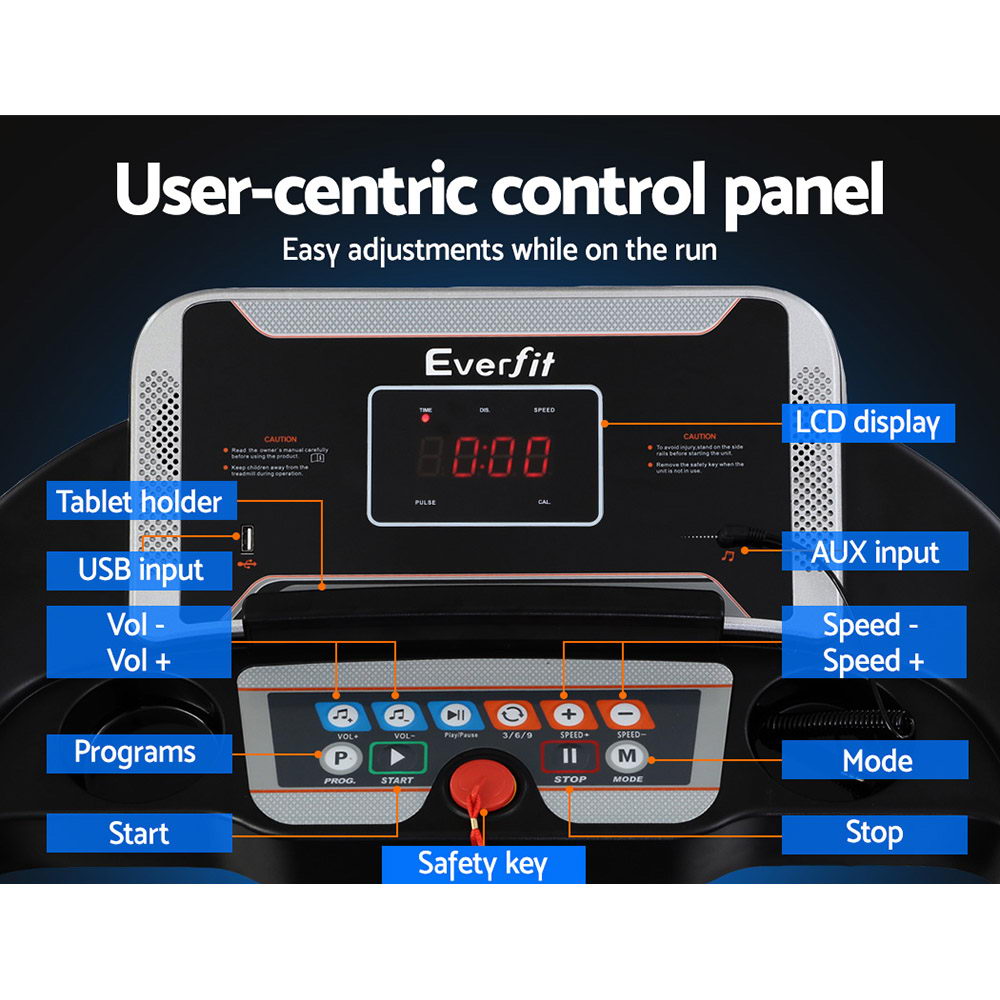 For a truly effective approach to weight loss and toning, our Everfit Electric Treadmill is your perfect companion. Compact and sturdy with its powder-coated steel frame, the treadmill allows you to perform essential cardio exercises within the comfort of your home. It features 12 pre-set training programs designed to simulate natural terrain. A user-centric control panel with a digital LCD display lets you set up to speeds between 1km/h and 12km/h and other monitoring parameters. Its powerful motor produces smooth and seamless operation and the anti-slip belt and soft-grip handlebar with pulse sensors make your session a comfortable and controlled experience. Other great features include a 3-level manual inclination adjustment, safety tether key, foldable design for easy folding and storage, and smooth wheels for easy mobility. Not least, the treadmill is also equipped with MP3 connection, speaker output and dual drink holders to keep you both entertained and hydrated. For health results that matter, our Everfit Electric Treadmill is the one to run to. Get yours today.