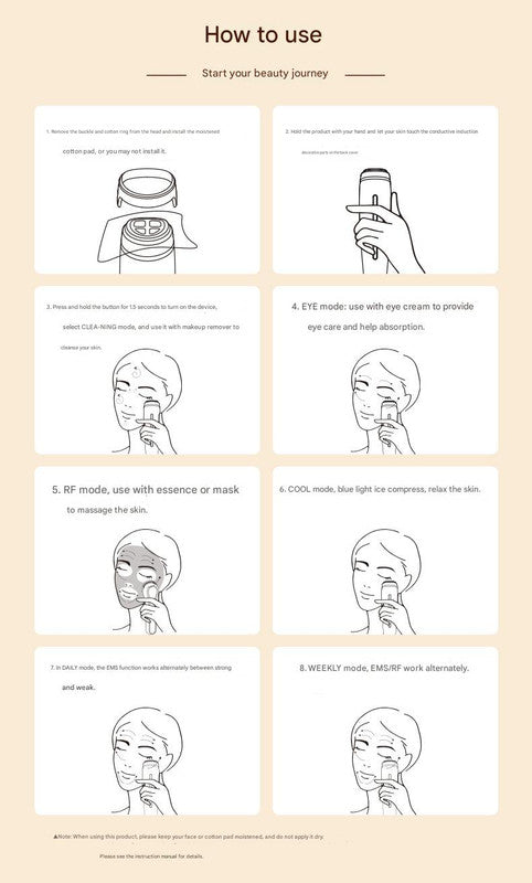 5. RF (Red Light) mode: Use with essence or face mask for skin massage.