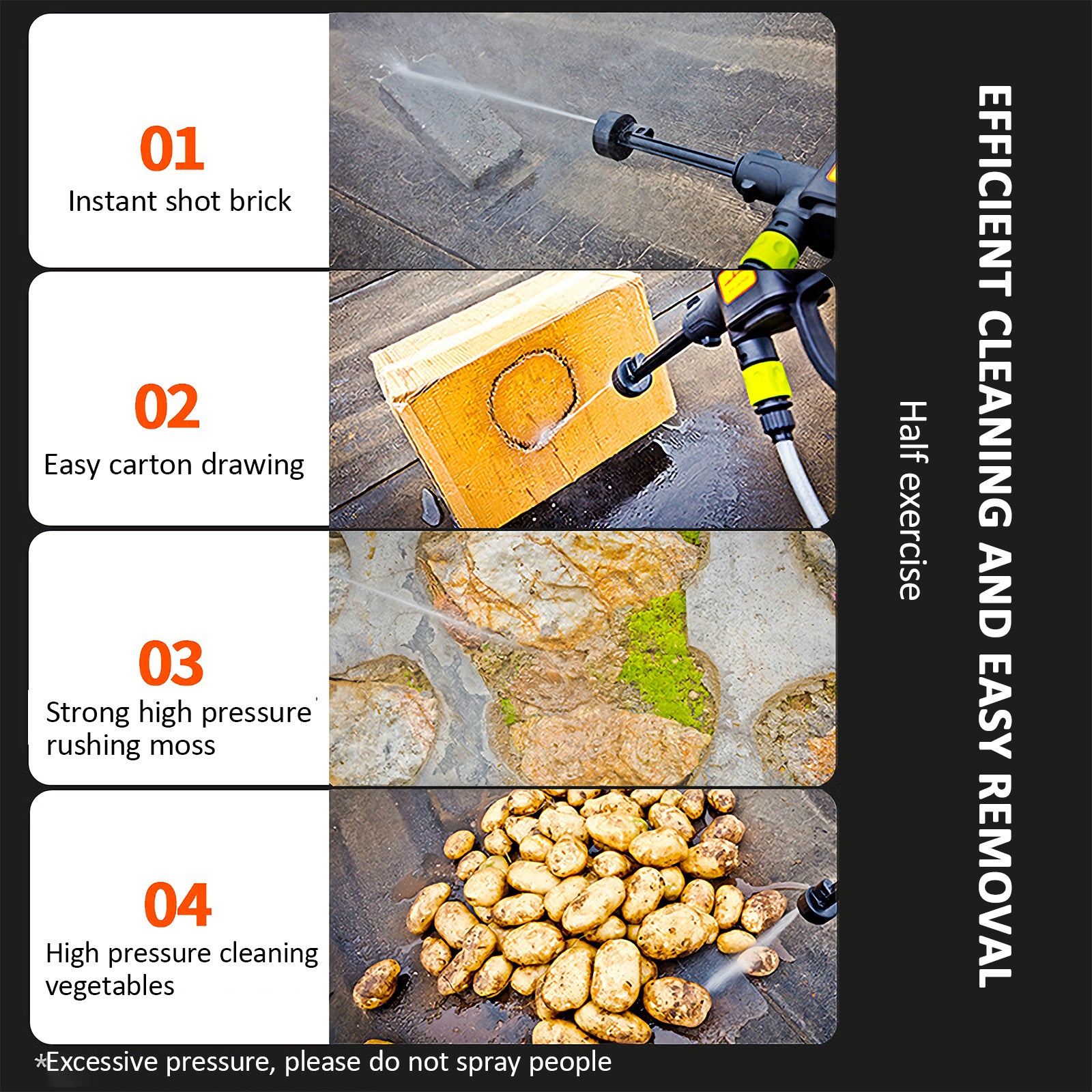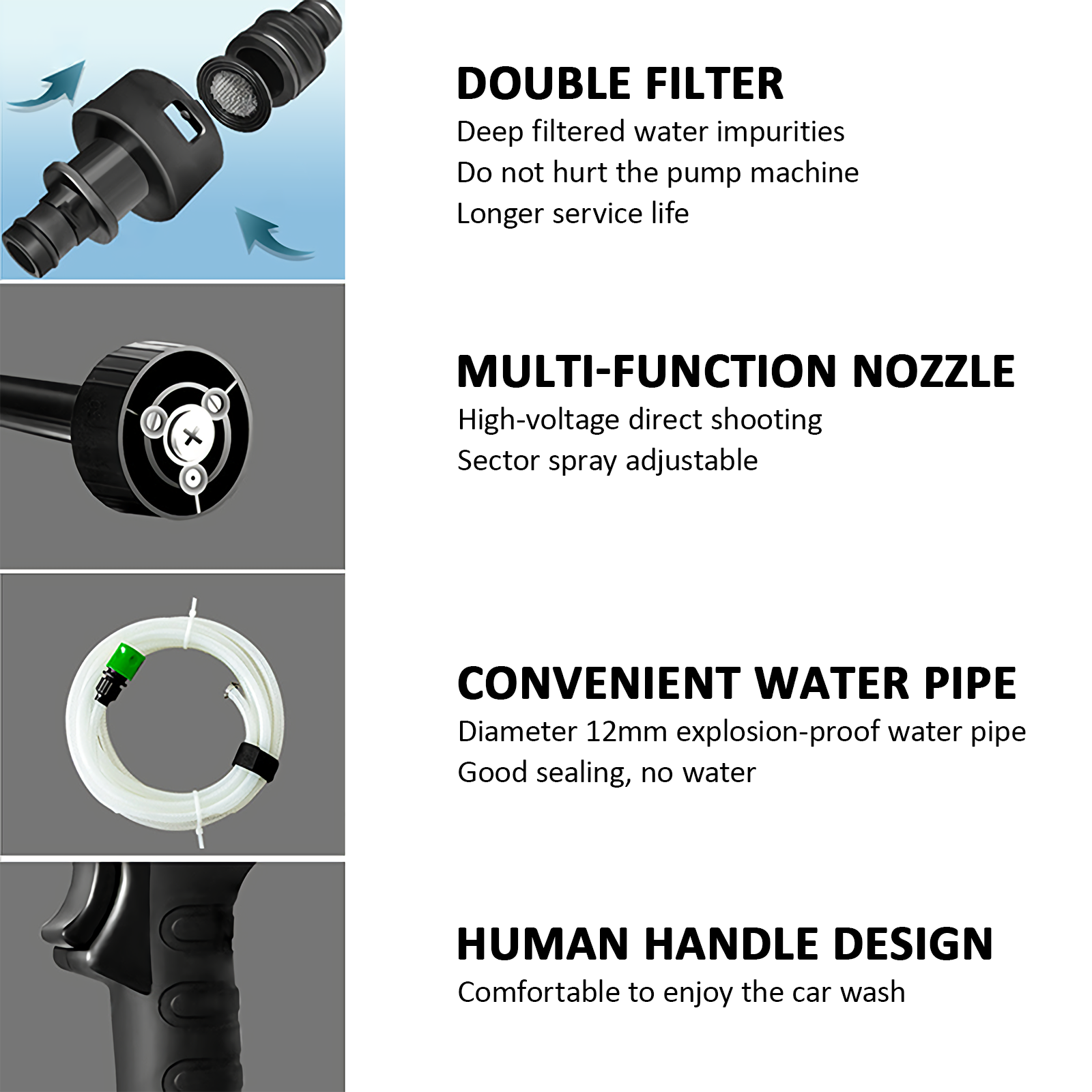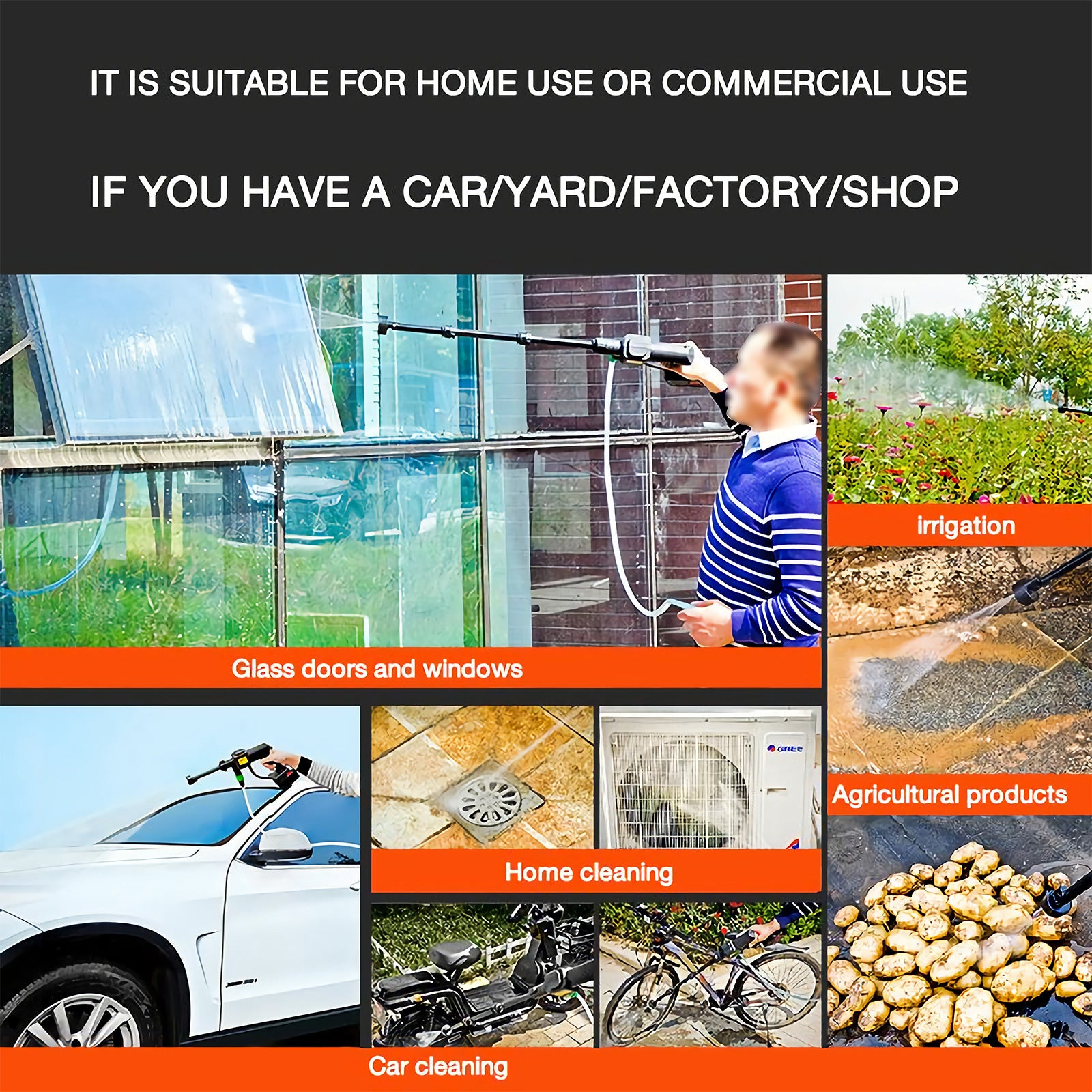 Technical Specifications: Model number: LB-X030Lithium Battery Capacity: 2000mAhMotor voltage U: 21VPressure: 17BarRated Battery Life: 25minsMax. rated flow rate:144 l/hMachine weight: 1.4kgColor: BlackApplication: car washing/bike washing/watering flowers/garden washing/furniture washing/pet bathing, etc. Feature: 1. The portable pressure washer has 3 different nozzle patterns: 0 degree, 20 degree, 40 degree, diagonal and shower, feel free to turn the nozzle to suit your needs to adjust a mode, which will save a lot of water. In addition, we also provide a nozzle with detergent container(approx.400ml), which can be used for daily cleaning. Fast foaming, fine and uniform foam, easy to wash the car. 2. The 20 ft hose with filter basket can effectively and deeply filter impurities, particles, waste leaves, sludge, etc., better protect our pressure machine. Compared with traditional washing machines, our cordless power washer is lighter and more portable. It is the best choice for outdoor camping and long trips. 3. Cleaning and maintenance of various motor vehicles, engineering vehicles, engineering machinery and agricultural machinery supporting products. It is the most ideal cleaning tool for individuals and small vehicle maintenance units to clean cars and motorcycles. 4. It is effective especially for cleaning the exterior walls of buildings, floors, baths, swimming pools, doors and windows, and corners that are difficult to clean manually. Quickly clean outdoor home surfaces, garden furniture, cars, stairs and pool dirt. The Package Include: Portable power washer machine X1, 21V 2.0Ah battery X1, 2.0Ah charger X1, 3-in-1 Multifunctional nozzle X1, Extension Rod X2, nozzle with detergent container X1, 20ft Suction hose with filter basket X1, Suctiono hose connectioner X1, Manual Instruction X1,