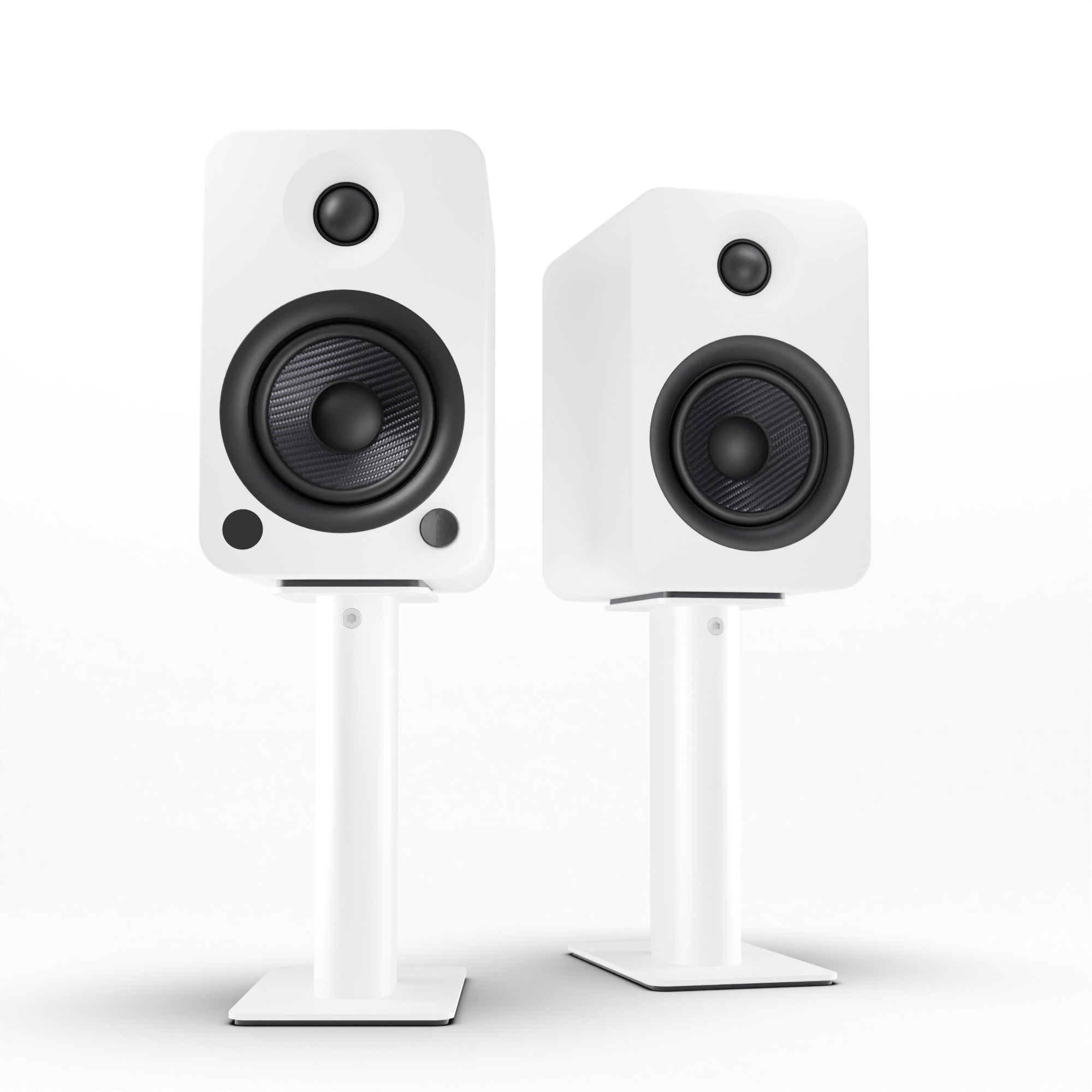 Experience exceptional sound quality with the Kanto YU4 140W Powered Bookshelf Speakers in Matte White. Designed for shared enjoyment, these speakers produce rich, spacious sound with their 140W peak power Class D amplifier. Featuring 4” Kevlar® drivers and 1” silk dome tweeters, they faithfully reproduce your favorite tunes with crystal-clear detail. With built-in Bluetooth® and a phono preamp, the YU4 offers seamless connectivity for vinyl or streaming music. Bundled with the Kanto SP9W 9" Tall Universal Desktop Speaker Stands, these stands elevate your speakers to optimal listening height, capturing a wider range of frequencies. Their heavy steel structure and closed cell foam padding minimize vibration, ensuring cleaner, more accurate sound. Enjoy a clutter-free setup with cable routing through the center of each stand. Immerse yourself in music with style and convenience.