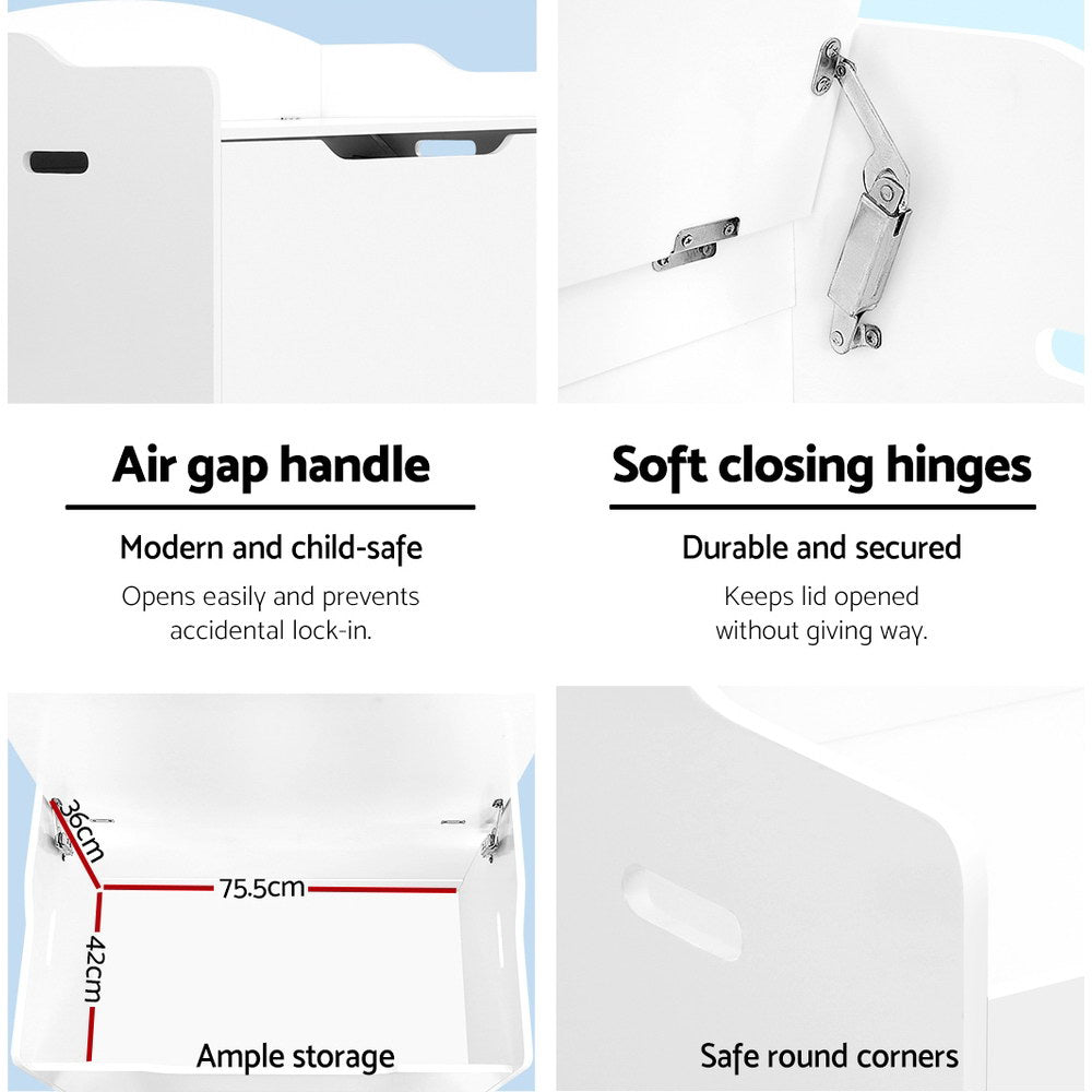 A bench and a storage box. Our Keezi Kids Storage Bench doubles up wonderfully to let your kids have a fun sitting area to do them do their thing and a neat and tidy storage for their toys, books and a whole lot more. Made of durable 12mm MDF board, the storage bench is strong and sturdy and looks absolutely adorable with its fresh white non-toxic painted finish.
