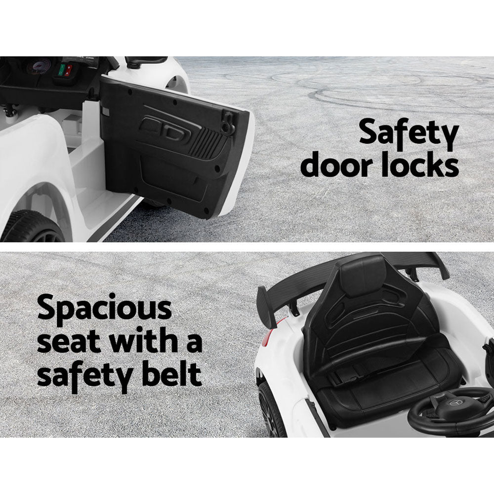Give your passionate little drivers a real-like driving pleasure and experience with this officially licensed Mercedes Benz ride on car. It's sure to make your young drivers happy with its looks, performance, and charisma. This ride on car makes an awesome present for your little driver as well as helps to foster gross motor skills in them. It features a distinctive exterior design with a stunning lacquer finish and solid build. It has rear wheel suspension for shock-absorbing and ultimate comfort, premium slip-resistant tyres, power indicator, smooth acceleration to prevent sudden jerks and stops, and a spacious seat with a safety belt for maximum comfort and protection. Plus, it has working head and tail lights, working doors with a lock for security, smart keyless start, and other functions like MP3 connection, built-in music with flashing lights, forward/reverse motion, and electronic brake for a real-like driving experience. Our Mercedes Benz kids ride on car is battery operated with up to 1.5 - 2 hours runtime per full charge and comes with a SAA-approved charger for safer and faster charging. The adult remote-control function and EN71 Standard Safety of Toys certification ensures the safety of your child. Gift your little ones this real-like and robust Mercedes Benz kids ride on car and watch them having unlimited fun with their mates.