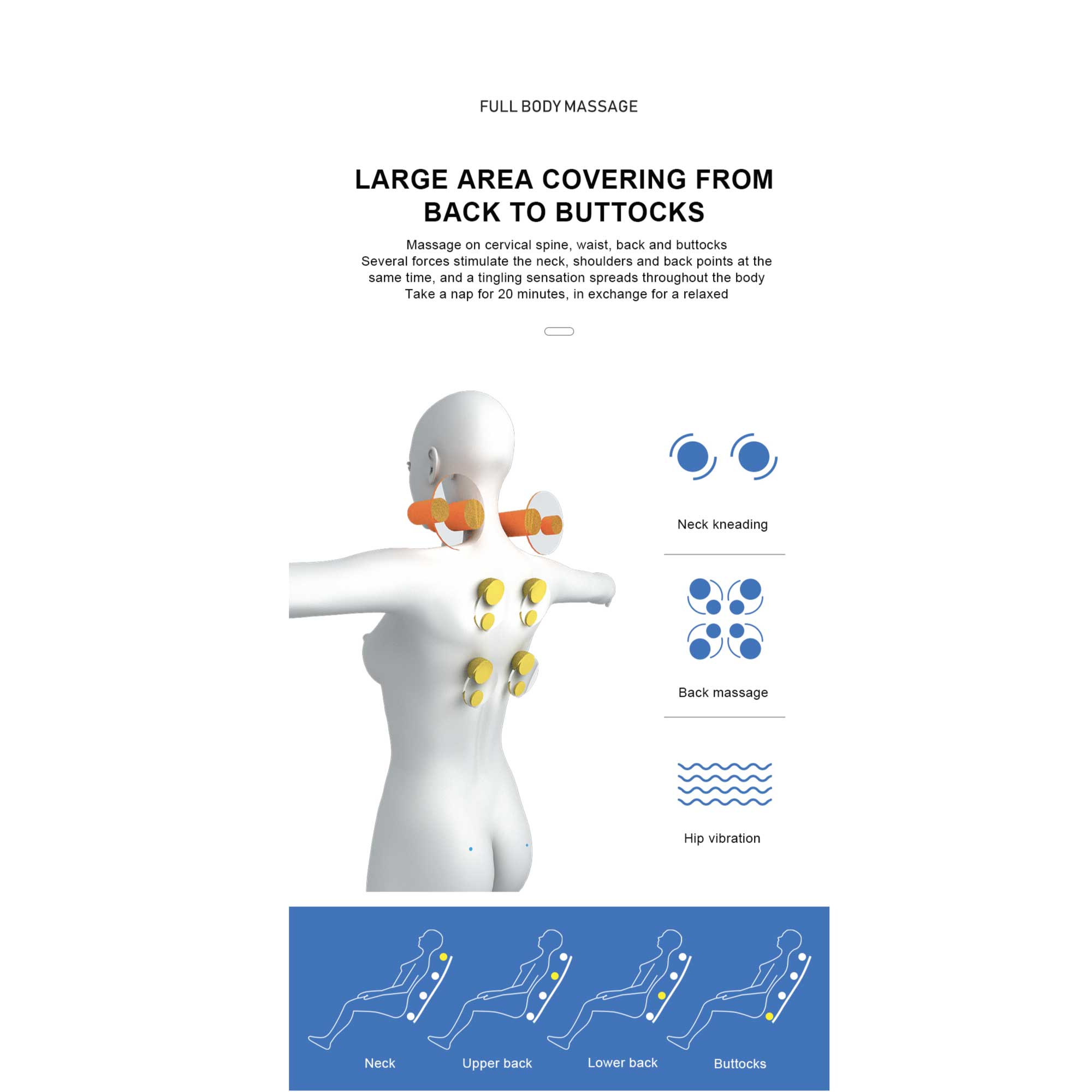 • 8 heating kneading massage nodes in total for upper back, whole back and lower back