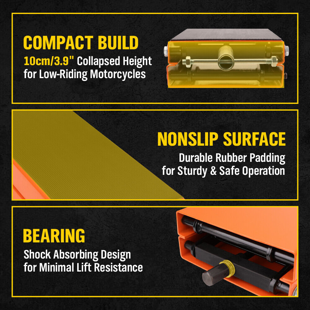 Non-slip Wide Deck: You don't like your motorcycle shaking and sliding on the small platform during lifting, do you? Our 14.4" x 9" extra-wide top platform provides a large contact area. And a durable rubber pad with a striped pattern prevents slipping and protects your motorcycle from scratches.