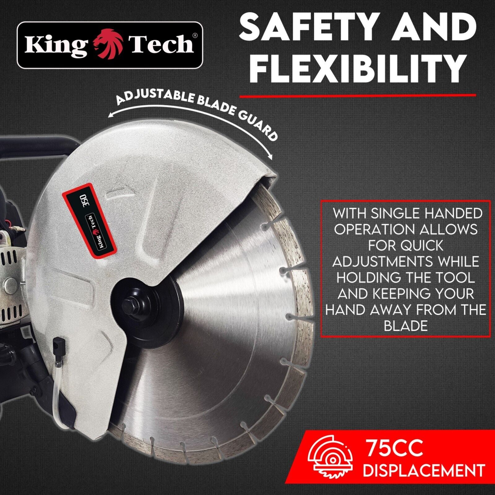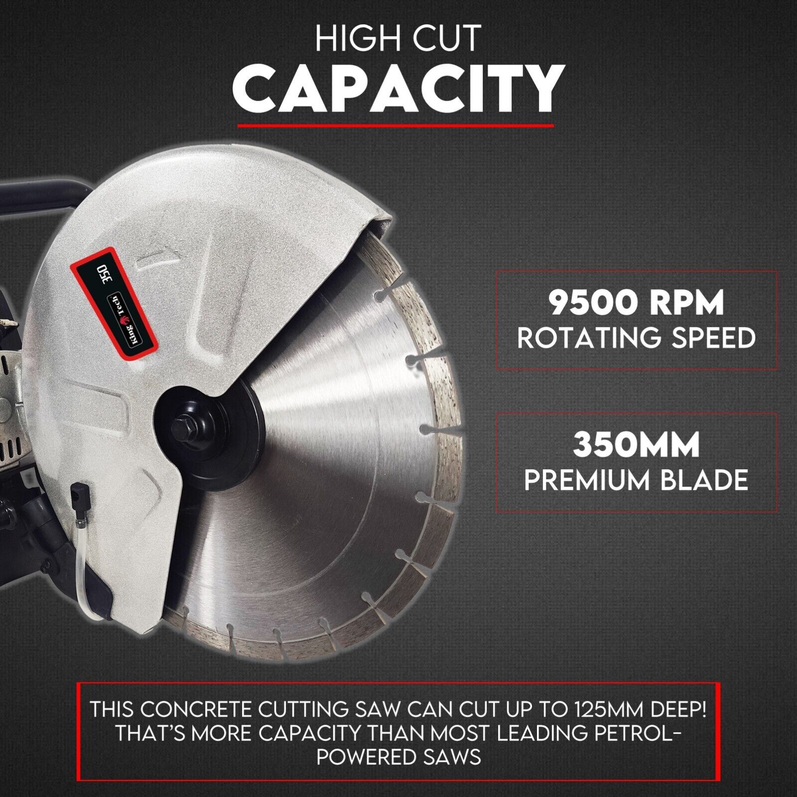 • Huge Cut Capacity. The all-new Kingtech 350mm concrete cutting saw can cut up to 125mm deep! That’s more capacity than most leading petrol-powered saws.