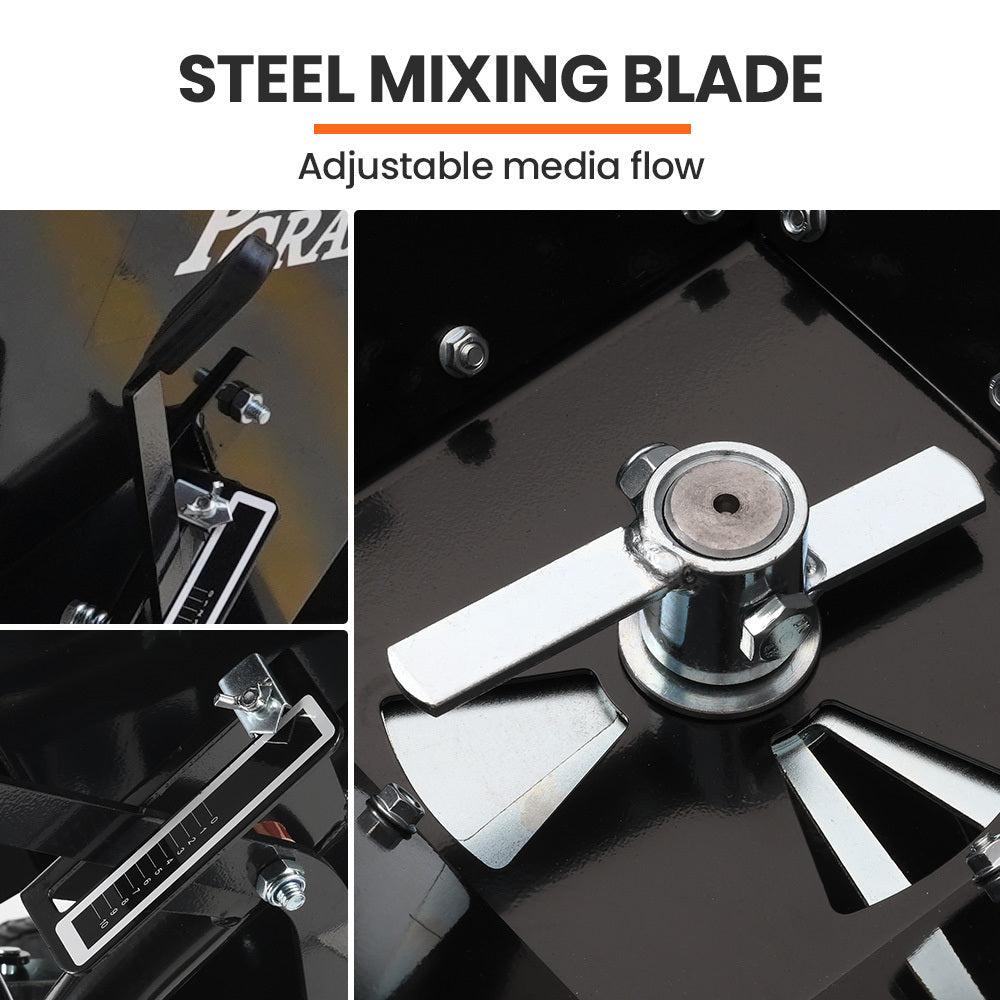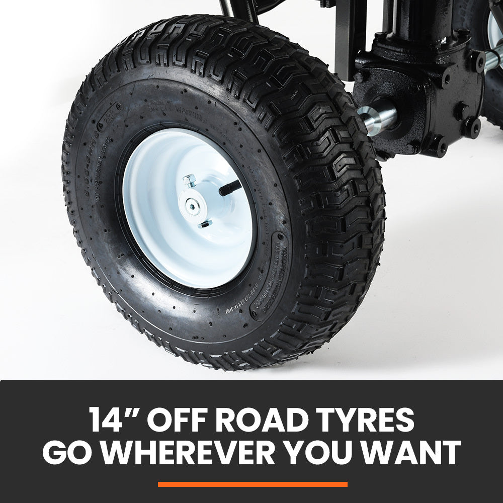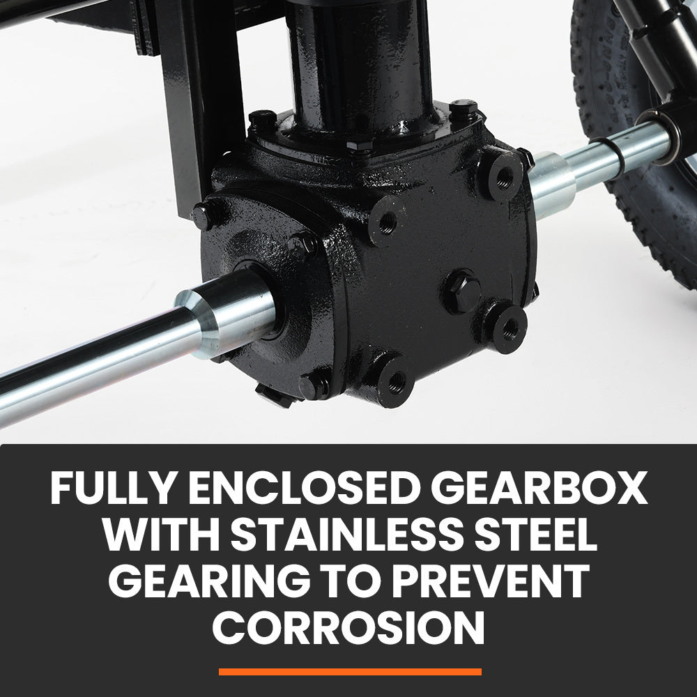 Equipped with wide 14” pneumatic tyres mounted on a stainless steel axle, it glides smoothly over various terrains. The hopper has a huge 160 L volume, and its high-quality structural steel construction ensures an impressive load capacity of 156 kg. It sits on a rugged tubular steel frame that’s powder-coated steel frame to ensure long-lasting use. The heavy-duty high carbon steel gears are surrounded by a cast iron, oil-filled gearbox guaranteeing reliable operation.