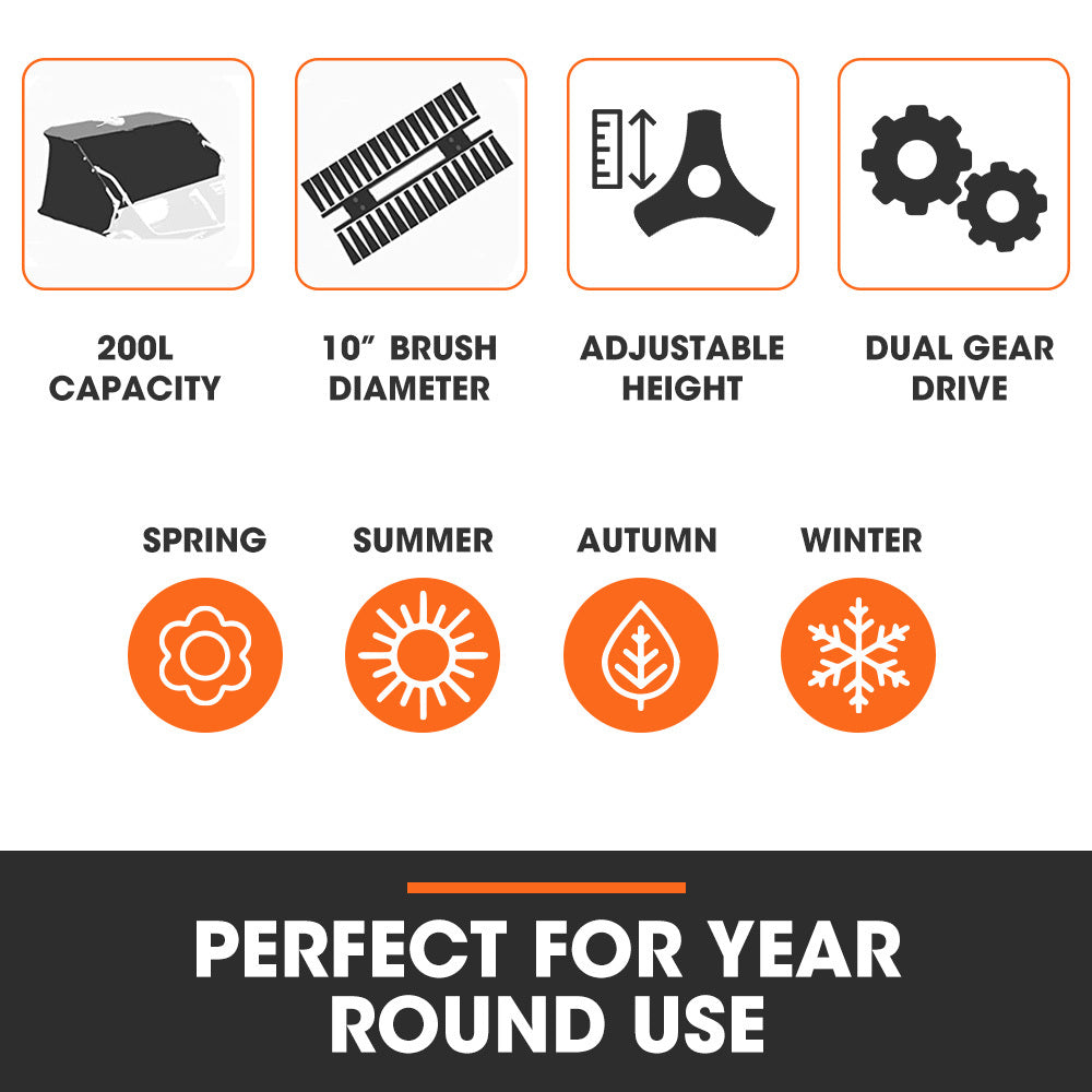 This PlantCraft Yard Sweeper features a 66cm clearing width and the sturdy steel body and frame are coated for corrosion resistance. With large durable 10 inch wheels it easily rolls over the terrain and they ensure the 4:1 geared brush drive is easy to push. The tough nylon bag has a large 200-litre capacity.