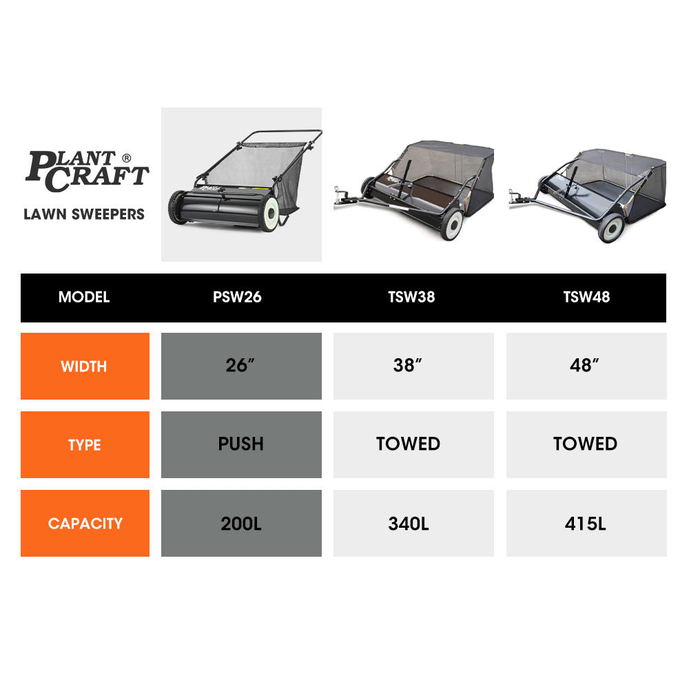 The PlantCraft 26' Push Lawn Sweeper, your ultimate solution for maintaining a pristine lawn, sidewalk, and driveway.