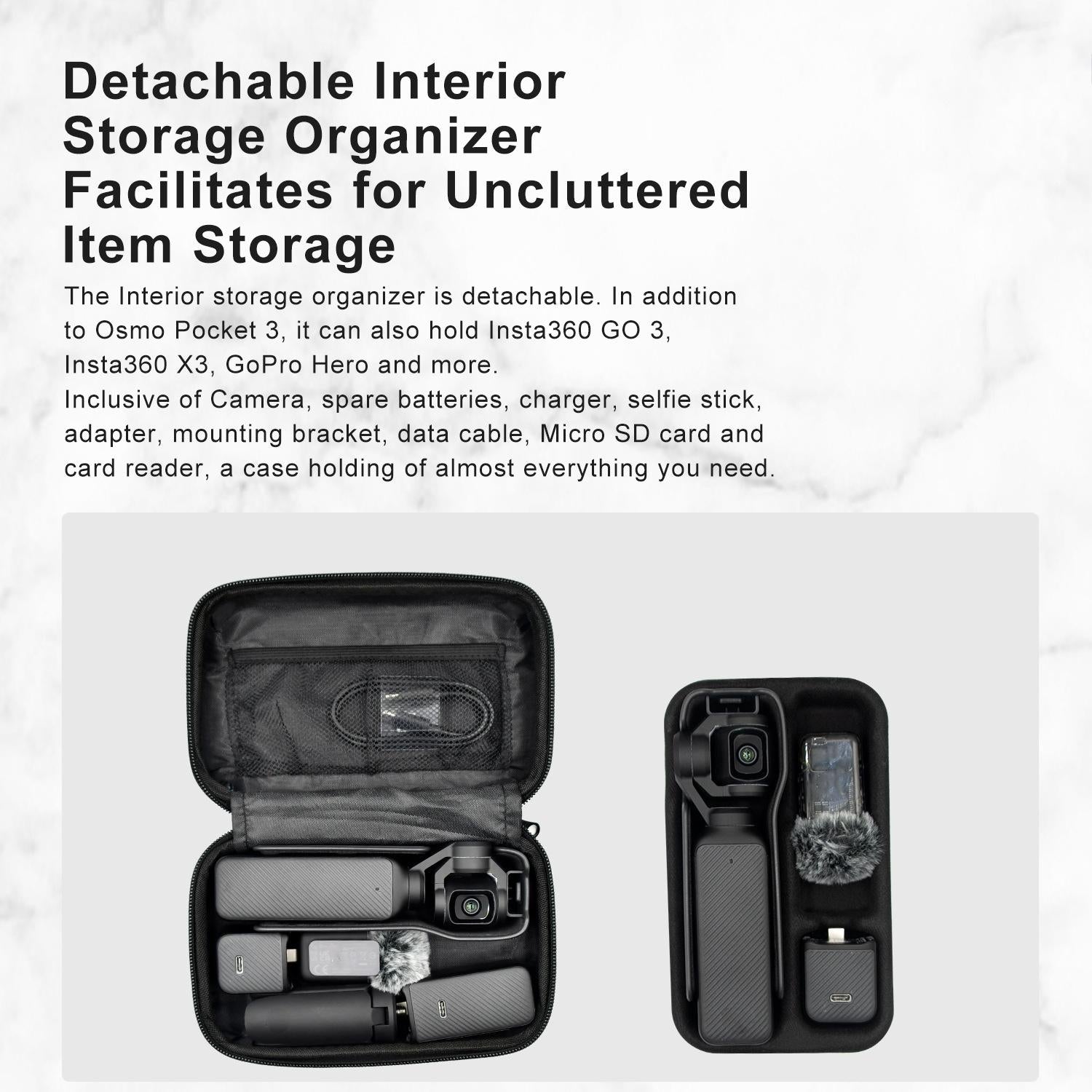 • Removable inner tray, after the inner tray is taken out, it can be compatible with GoPro Hero, GoPro MAX, Insta360 X3 / GO3 / GO2 / ONE RS, DJI Action and so on