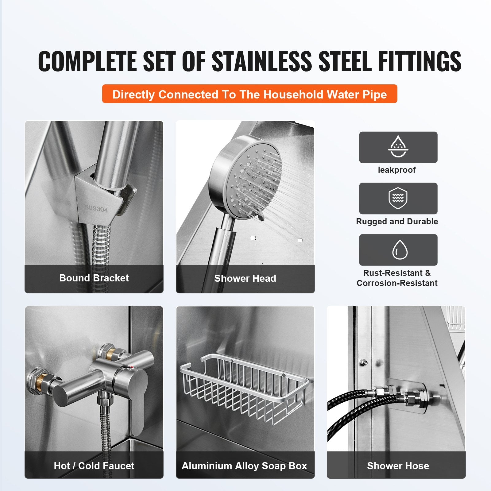 Equipped with a showerhead, faucet, and stainless steel support frame that can be connected directly to the household hose. They are rust-resistant and durable. An additional aluminum alloy soap dish is included for long-lasting use.