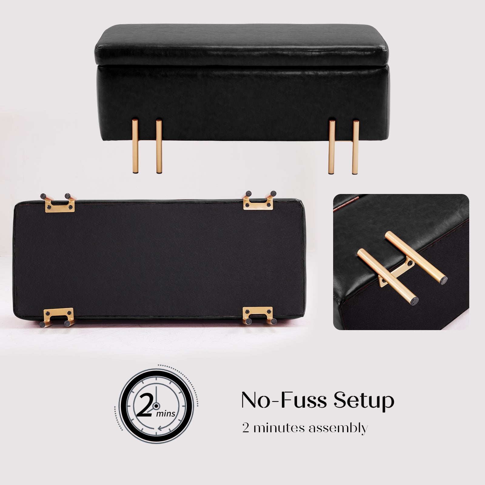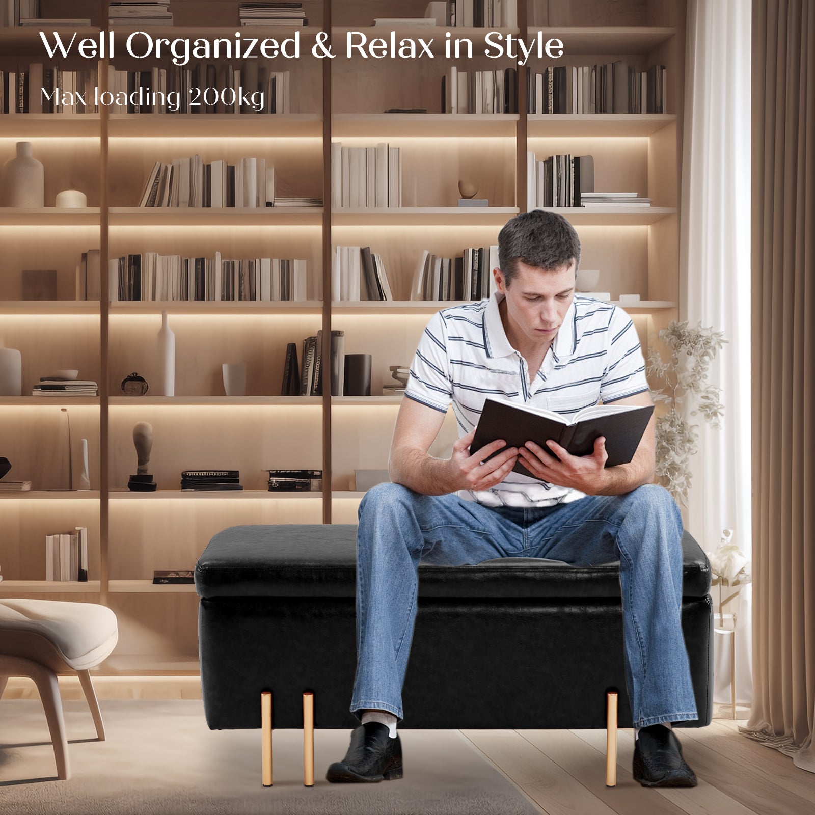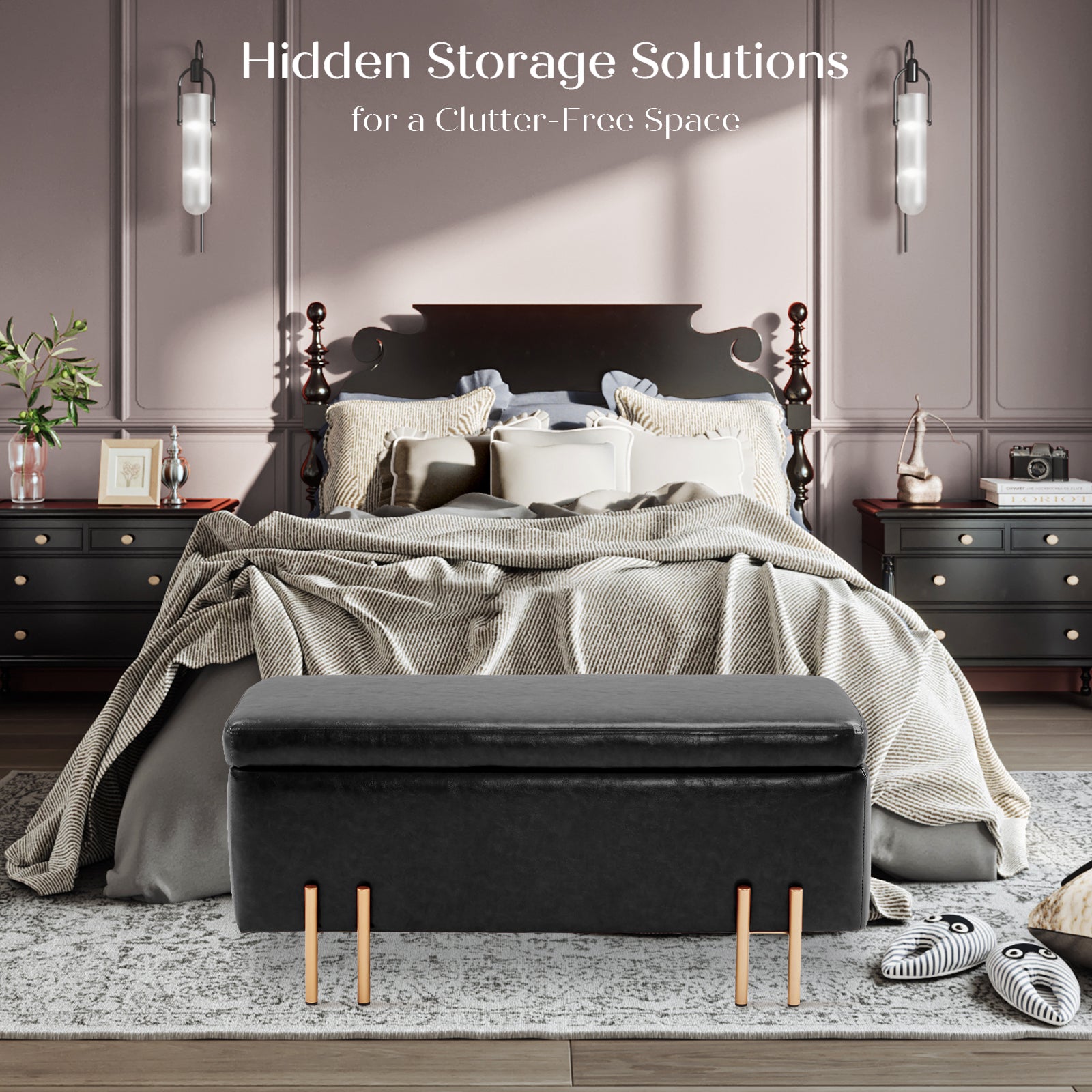 Supported by sleek metal legs, the ottoman brings contemporary charm with stability and durability. Lift the lid to reveal ample storage space for blankets, pillows, and more, effortlessly keeping your living area clutter-free.