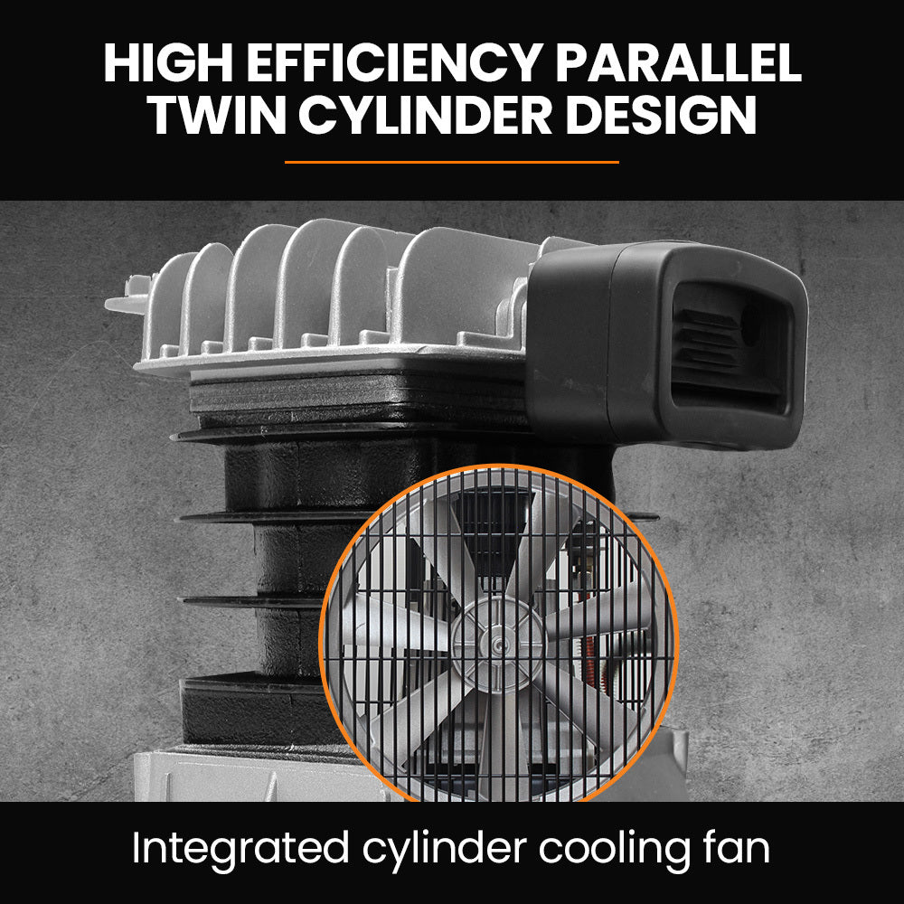 The heart of this machine is a robust cast iron parallel twin-cylinder compressor with aluminium pistons. An integrated aluminium after-cooler, assisted by the integrated fan in the drive pulley, ensures less moisture and contamination in your air hose. The cooler output air temperature also contributes to the compressor's overall efficiency and performance. The unit also features a pump speed of 920 rpm and a duty cycle of 0.75, ensuring consistent and reliable performance. The pump has an outstanding air displacement of 280L/Min (9.9 CFM), giving it powerful air delivery for demanding applications.